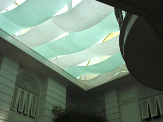 | 天井から入ってくる光を遮るうすい和紙のような布があって、写真では薄暗く映っていますが、なんともいえない気持ちい空間が作り出されています。 | ![]() |